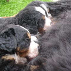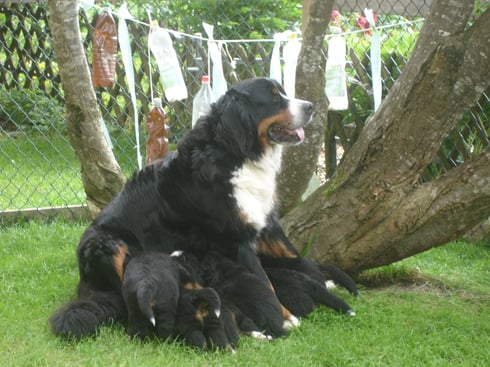Wir geniessen draussen das schöne Wetter und die gute Milch unserer Mutter Roya.
